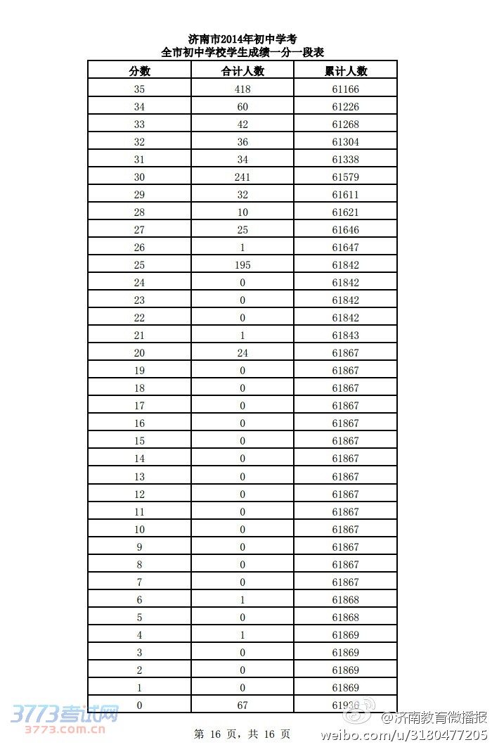 2014济南中考分数段公布(一分一段表)