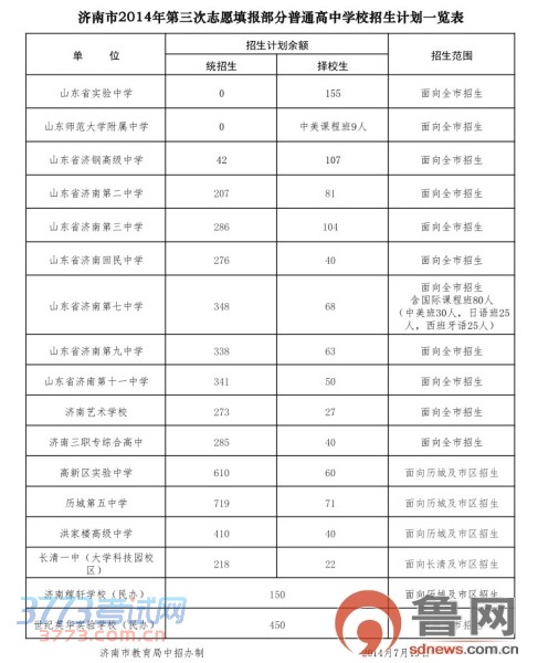目前,三所推荐生试点学校剩余招生计划313人。包括山东省实验中学剩余155个择校生计划,山东师范大学附属中学中美课程班剩余9个择校生计划,山东省济钢高级中学剩余42个统招生计划和107个择校生计划。市直属8所非推荐生试点高中的剩余招生计划共有2827人,济南二中剩余招生计划有288人,其中剩余统招计划有207人,择校计划有81人;济南三中剩余招生计划有390人,其中剩余统招计划为286人,择校计划有104人;济南七中剩余招生计划有416人,其中剩余统招计划348人,择校计划有68人;济南九中剩余招生计划有401人,其中剩余统招计划338人,择校计划63人;济南十一中剩余招生计划有391人,其中剩余统招计划341人,择校计划50人;济南回民中学剩余招生计划316人,其中剩余统招计划276人,择校计划40人;济南三职专综合高中剩余招生计划325人,其中剩余统招计划285人,择校计划40人;济南艺术学校招生计划300人,其中剩余统招计划273人,择校计划27人。另外,还有四所面向历城及市区招生的高中、一所面向长清及市区招生的高中,两所民办中学也在本次填报志愿的范围内。