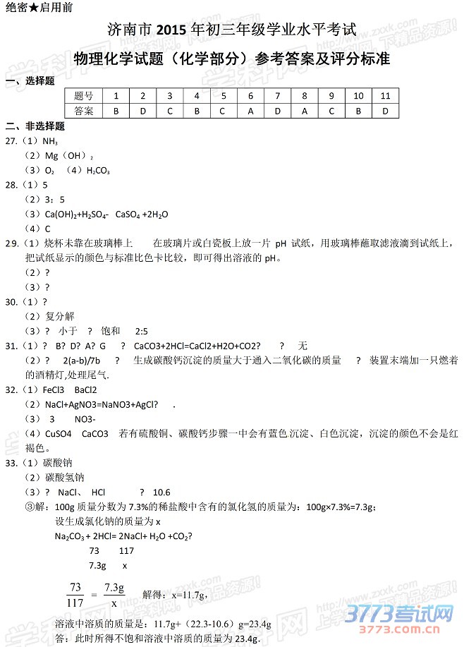 及时公布中考试题、答案和中考作文。祝各位考生都能取得好的成绩。2015年山东济南中考化学答案(图片版):