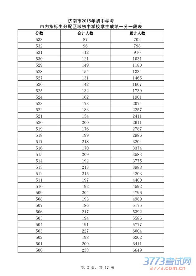 济南市2015年初中学考市内指标生分配区域初中学校学生成绩一分一段表