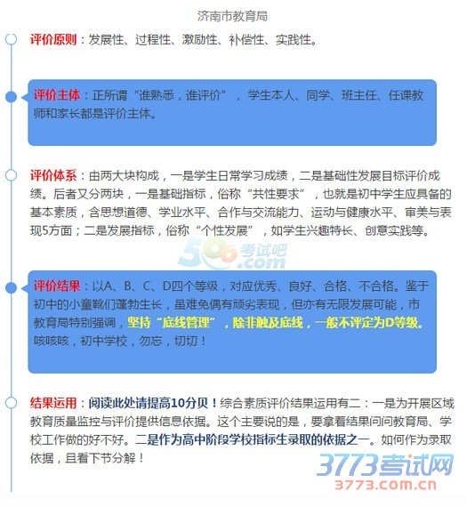 贯彻山东省基础教育综合改革精神,落实《山东省委办公厅省政府办公厅关于推进基础教育综合改革的意见》(鲁办发[2014]55号)、《关于普通中小学招生入学工作的指导意见》(鲁教基发[2015]4号)《关于完善初中学业水平考试和综合素质评价制度的指导意见》(鲁教基发[2015]5号) 等文件要求,日前,《济南市教育局关于进一步深化初中学生综合素质评价的指导意见》(济教基字〔2015〕10号)、《济南市教育局关于完善初中学业水平考试及高中阶段学校招生工作的指导意见》(济教基字〔2015〕11号)等涉及济南“中考”招生制度改革及学生综合素质评价的新政正式出台。