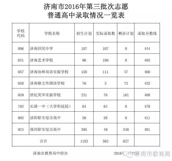 无线济南7月27日讯今天上午,济南市教育局中招办发布公告,通报了济南市2016年高中阶段学校招生第三批次志愿填报录取情况,及整体录取情况。