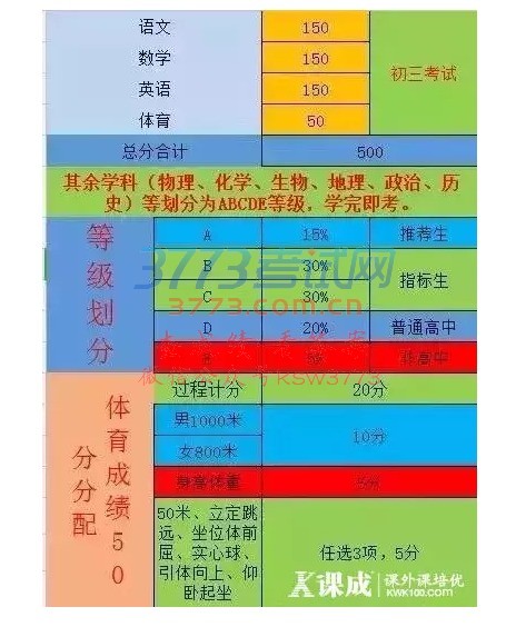 从2018年学考开始(现初三),学考分值满分为500分(语文、数学、英语各150分,体育50分);其余学科(物理,化学,生物,历史,地理)只划分等级,分ABCDE五等级。体育50分,按照实分计入总分。
