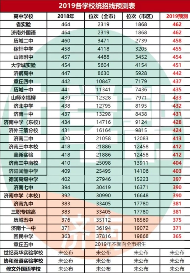 各位家长大家好,教育局在今天公布了济南2019年全市中考学生成绩一分一段表和市区学生成绩一分一段表,根据这两个表再结合去年各高中统招分数线和一分一段表,我们对今年济南高中的统招线进行了预测,预测结果仅仅作为参考,大家还是要理性对待,慎重选择!