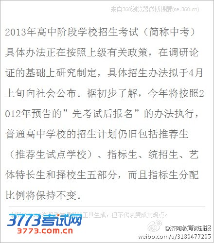 【关于网传2013年中考政策的有关说明】2013年高中阶段学校招生考试(简称中考)具体办法正在按照上级有关政策,在调研论证的基础上研究制定,具体招生办法拟于4月上旬向社会公布。