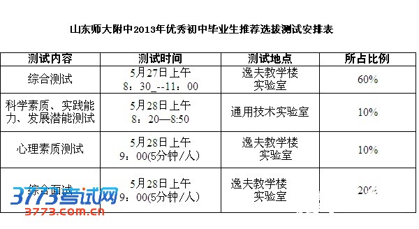山东师大附中2013年优秀初中毕业生推荐选拔测试安排表