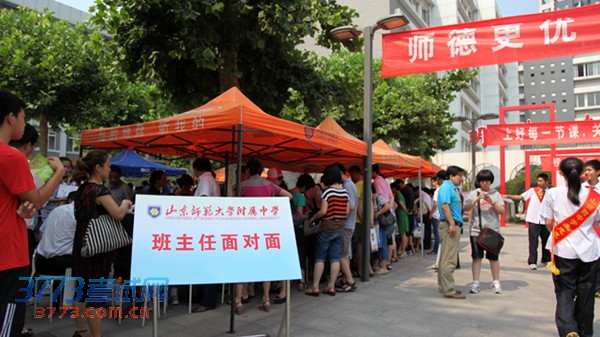 7月6日,根据省教育厅和市教育局的有关要求,山东师大附中在校本部和幸福柳校区同时举办2013年校园开放日活动。广大学生和家长走进校园,与附中零距离接触,全方位感受具有大学附中教育特色的山东师大附中。 校园开放日活动中,附中设立了“名师面对面 ”“济南市优秀班主任面对面”“优秀学子面对面”“高中生心智发展指导”等咨询服务台,由附中校领导、全体中层干部、附中名师和2013届优秀毕业生就学生、家长关心的教育均衡发展、教育教学质量等问题进行了详细的解答。 开放了先进的机器人实验室、科技创新实验室、理化生探究数字实验室、地理教学专用教室和历史教学专用教室等教育教学设施,展示了学生参与探究式教学活动。由高一志愿者引导广大家长和学生通过实地参与近距离地了解了附中的教育、教学、生活环境,感受附中所特有的、具有大学附中特色的学校文化。在幸福柳校区,家长和学生参观了食堂、宿舍区和教室。附中方便、安全、舒适的住校环境获得了家长的一致认可。因为天气炎热,附中特地为每位家长提供免费饮用瓶装水,并在报告厅设置休息区。 通过今年的校园开放日活动,山东师大附中向广大中学生、家长及社会全面展示了两个校区的教育、教学、课堂、生活场馆及设施;展示了附中在素质教育、课程改革、学生德育建设、教师素质提升、校园文化建设和学校安全等多方面的情况;展示了附中教育教学管理的成绩和厚重庄严而不矜、灵动激扬而不傲、秉随传统而不怠的校园文化,使社会各界对附中有了更全面、更深入的了解。