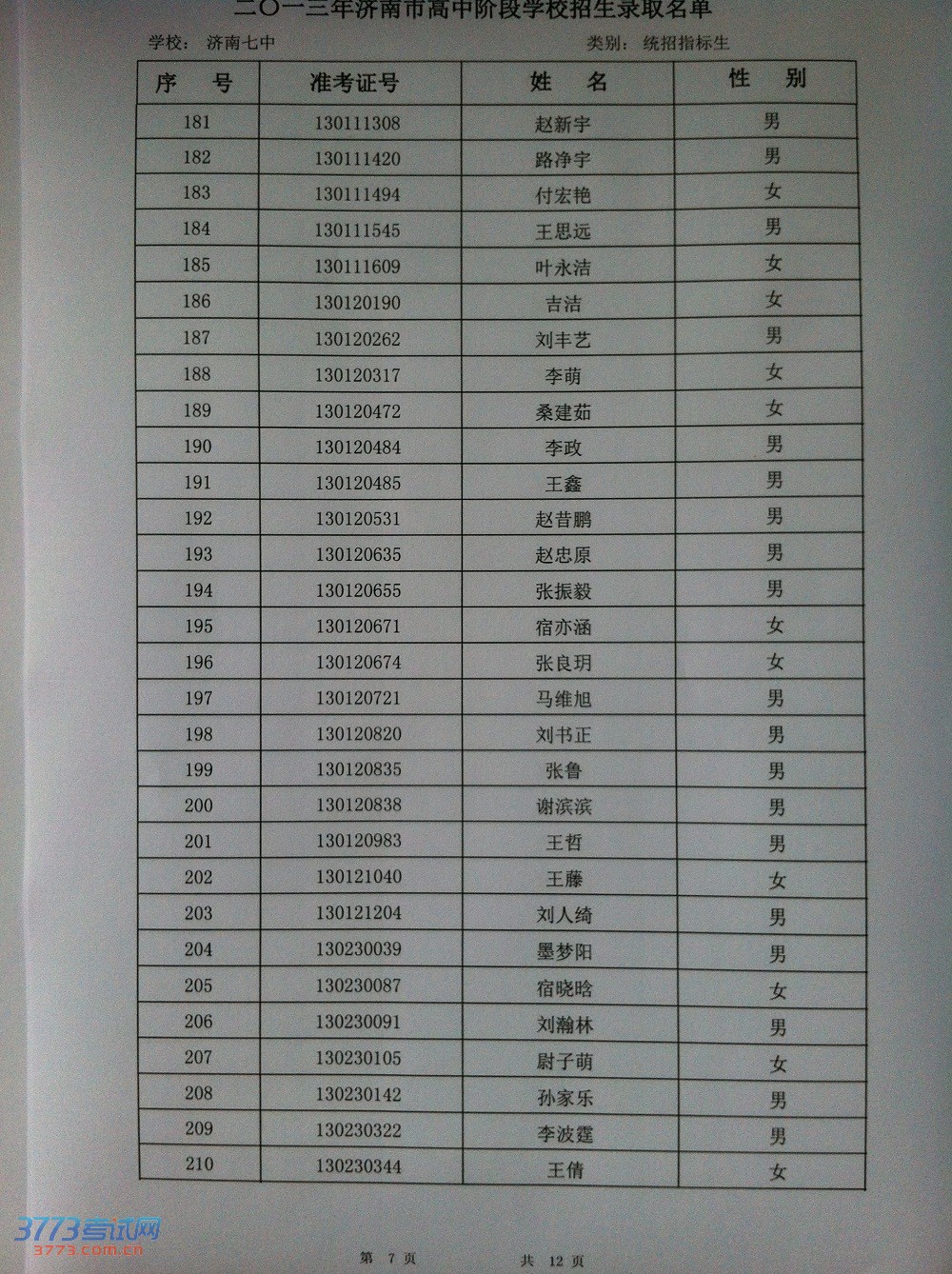 2013济南七中指标生录取名单