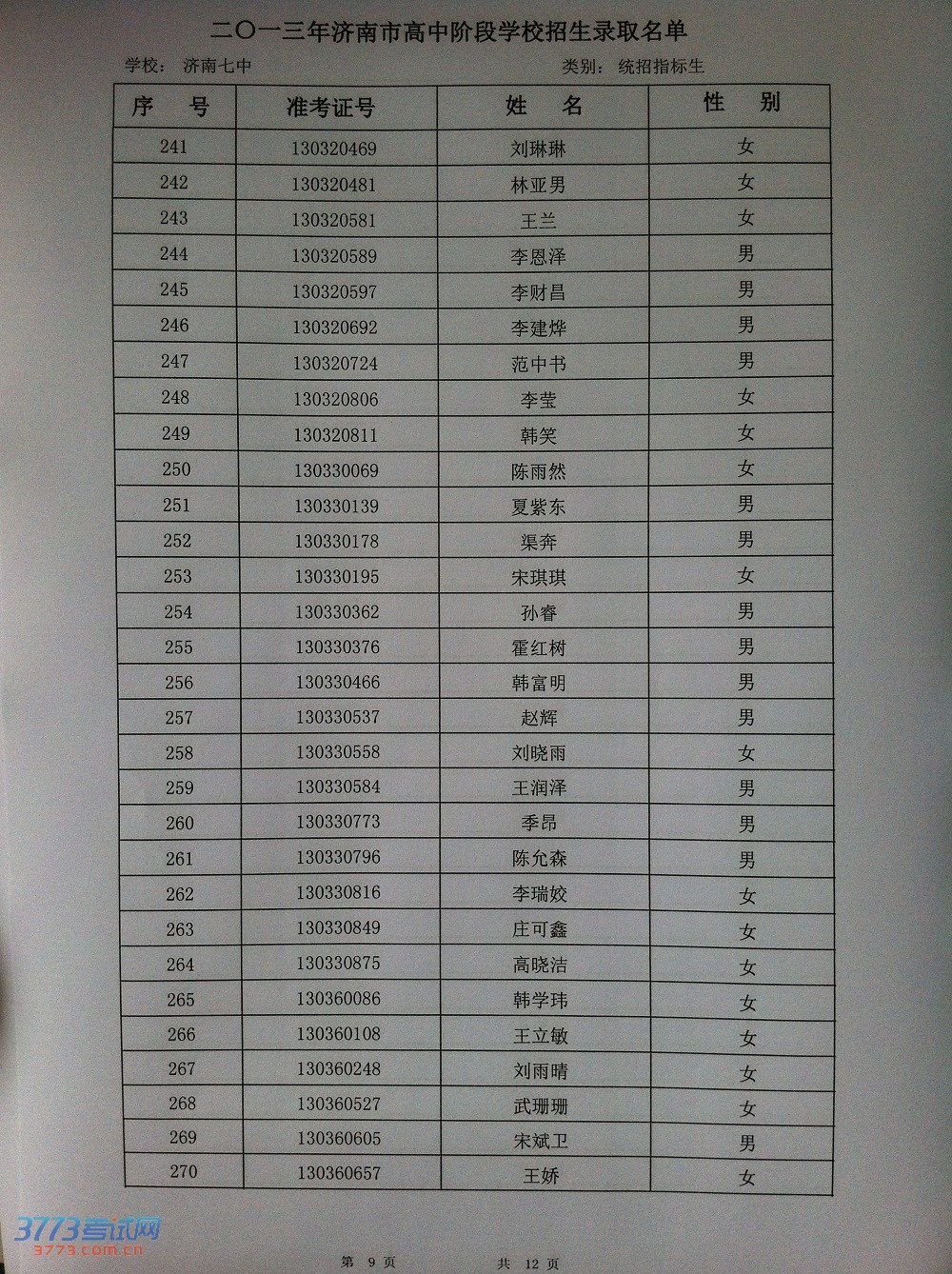 2013济南九中统招指标生录取名单