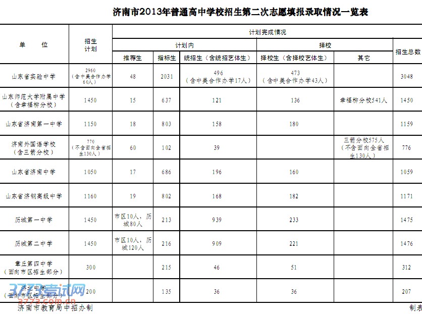 济南市2013年普通高中学校招生第二次志愿填报录取情况一览表