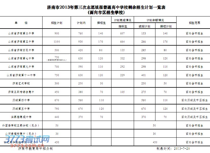 济南市2013年第3次志愿填报普通高中学校剩余计划一览表(面向市区招生).pdf