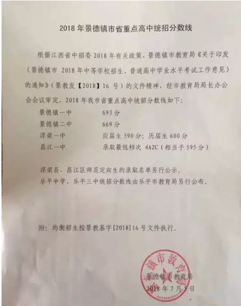 公布了!2018年景德镇市省重点高中统招分数线!