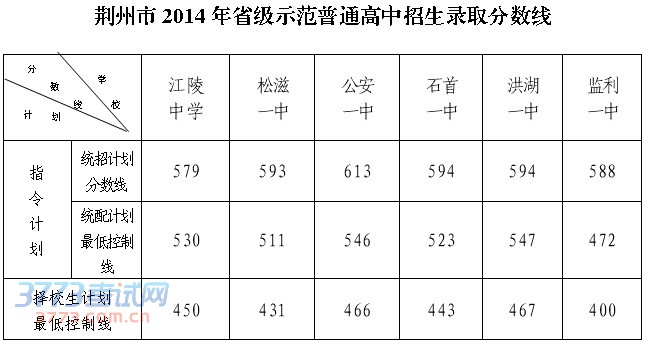 荆州市2014年省级示范普通高中招生录取分数线