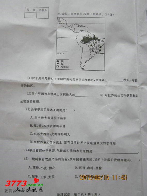2012年济宁中考地理试卷答案及评分标准