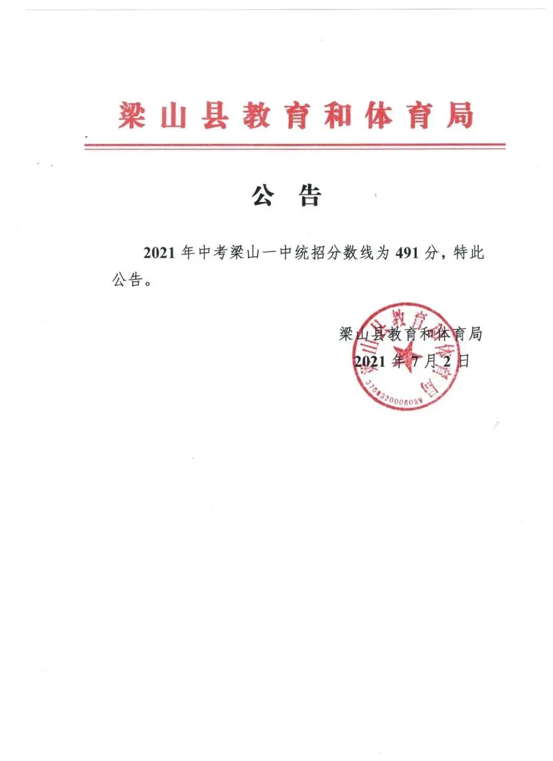 2021年山东济宁梁山县普通高中录取分数线