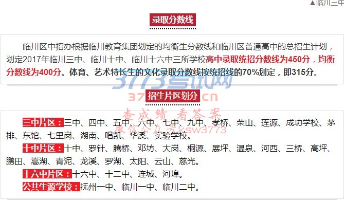 临川区中招办根据临川教育集团划定的均衡生分数线和临川区普通高中的总招生计划,划定2017年临川三中、临川十中、临川十六中三所学校高中录取统招分数线为450分,均衡分数线为400分。体育、艺术特长生的文化录取分数线按统招线的70%划定,即315分。