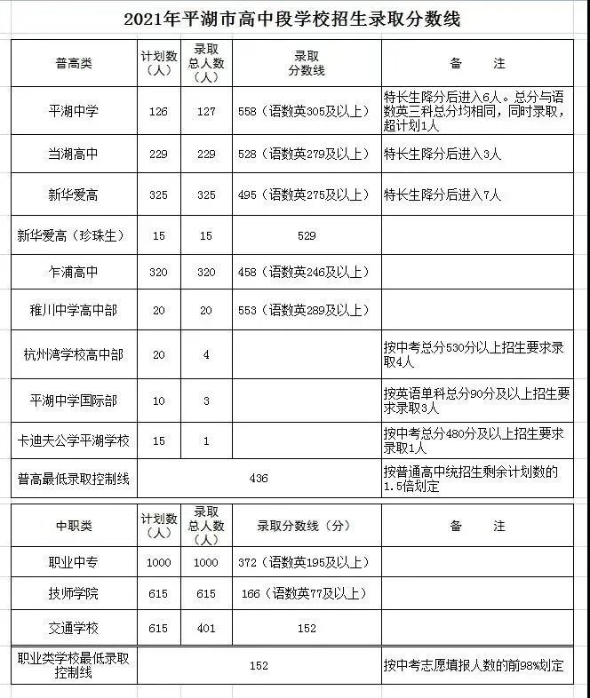 2021年平湖市高中段学校招生录取分数线划定,今年普高最低控制线为436分。一起来看一下各批次学校、招生计划和录取分数线—— 2021年平湖市高中段学校招生录取分数线和录取人数