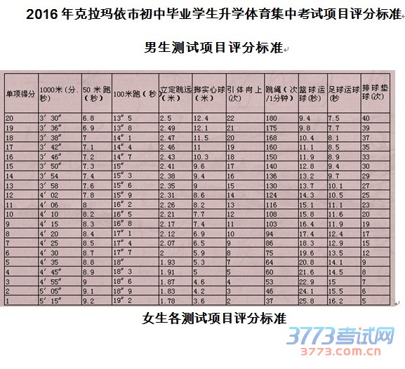 2016克拉玛依中考体育考试项目评分标准