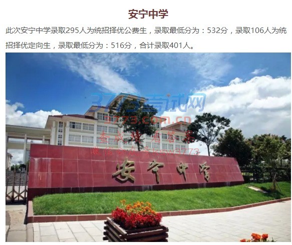 此次安宁中学录取295人为统招择优公费生,录取最低分为:532分,录取106人为统招择优定向生,录取最低分为:516分,合计录取401人。