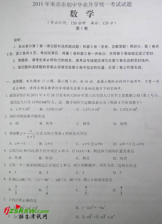 2011年来宾市初中毕业升学统一考试试题数学考试时间 120分钟 满分120分第I卷一、选择题 本大题共12小题 每小题3分 共36分 在每小题给出的四个选项中 只有一项是正确的 请选出来并将其对应的字母填写在第II卷相应题号下的空格中。