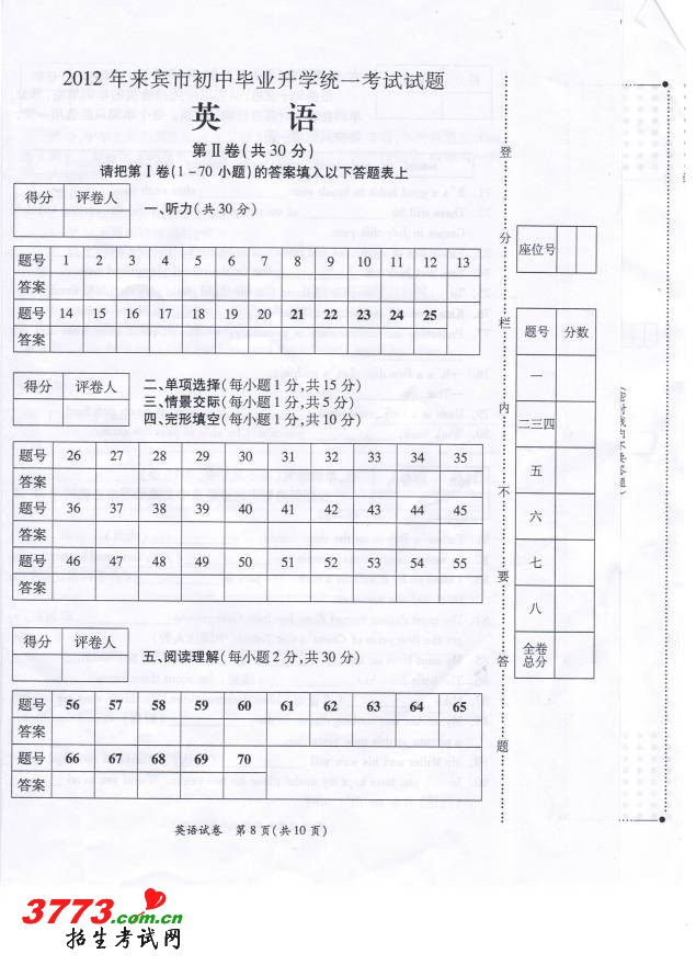 2012年来宾市中考英语试题及试卷答案