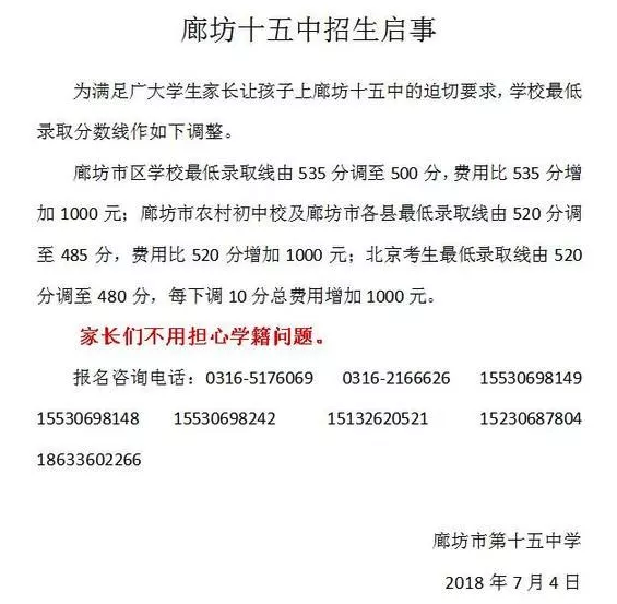 廊坊十五中最新招生通知!最低录取分数线又降了!!