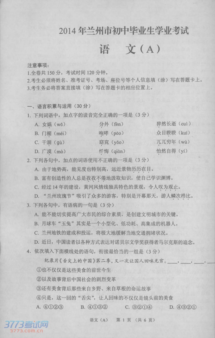 2014兰州初二中考科目Ⅱ地理生物考试举