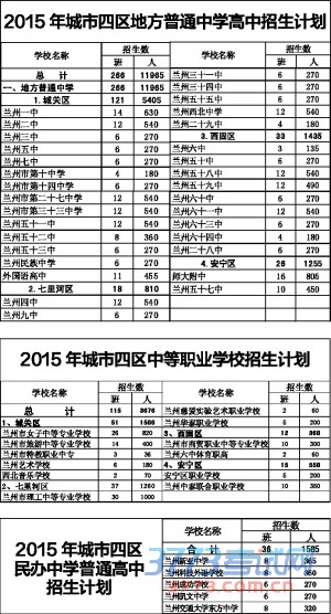 今年城市四区地方学校、事业学校、民办学校2015年预计初中毕业生22377人,高中阶段计划招生22318人,初中毕业生升学率为99.74%。其中:地方普通高中下达招生计划266班(含特长班),11965人,占城市四区高中阶段计划招生人数的53.61%。特长班招生以兰州生源为主,在全省范围内提前招生,具体如下: