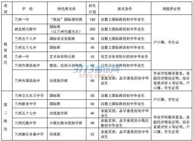 志愿设置(1)普通高中:共设四个批次 10 个志愿。 6 ①提前批次:省级示范性高中的特色班招生。设 1 个志愿。符合报考条件的考生最多可填报一个特色班志愿。考生报名资格由学校初审、市教育局审批备案。天津南开中学在本批次提前单独招生。考生可在填报本市学校志愿的同时,填报南开中学提前单独招生志愿。 ②第一批次:省级示范性高中(含兰州四中)的普通班。设 4 个志愿:统招第一志愿、统配志愿、自主招生志愿、统招第二志愿。考生可填报本批次一个或多个志愿,也可以不填报本批次全部志愿。统招第一志愿、统配志愿和自主招生志愿必须为同一所学校;符合对口分配条件的考生可以填报统配志愿;通过学校自类别学 校 特色班名称 招生计划报名条件 须提供证明提前批次兰州一中 “致远”国际课程班 180 自愿上国际班的初中毕业生户口簿、学生证西北师大附中 国际班(以兰州生源为主) 260 自愿上国际班的初中毕业生兰州五十八中 国际语言实验班 90 自愿上国际班的初中毕业生兰州五十九中 国际班 40 自愿上国际班的初中毕业生兰州一中 艺术体育特长班 45 有艺术体育特长的初中毕业生兰州外国语高中 德语、法语小语种班 50 已学习小语种的初中毕业生兰州外国语高中 双优助学班 90 家庭贫困、品学兼优的初中毕业生毕业学校推荐意见、家庭经济情况证明、综合素质评价 A 等证明、户口簿、学生证等第二批次兰州交大东方中学 国际班 50 自愿上国际班的初中毕业生户口簿、学生证兰州新亚中学 国际班 50 自愿上国际班的初中毕业生兰州五十七中 双优助学班 90 家庭贫困、品学兼优的初中毕业生 毕业学校推荐意见、家庭经济情况证明、综合素质评价 A 等证明、户口簿、学生证等兰州民族中学 少数民族双优助学班 90 家庭贫困、品学兼优的少数民族初中毕业生兰州新区舟曲中学 珍珠班 35 家庭贫困、品学兼优的初中毕业生 7 主招生测试的考生可以填报自主招生志愿;统招第二志愿和统招第一志愿必须为不同学校。 ③第二批次:市级示范性高中和一般高中。设 4 个志愿:特色班志愿、统招第一志愿、自主招生志愿、统招第二志愿。考生可填报本批次一个或多个志愿。统招第一志愿和自主招生志愿必须为同一所学校;通过学校自主招生测试的考生可以填报自主招生志愿;统招第二志愿和统招第一志愿必须为不同学校。 ④第三批次,网上征集志愿。未被任何一个志愿学校录取的考生可在规定时间内登录“兰州市中考网上报名系统”,参加未完成招生计划的普通高中学校的志愿征集。(2)中等职业学校:设 2 个志愿。报考中等职业学校的考生可直接填报职业学校志愿,每个考生最多可填报两所职业学校志愿。未填报职业学校志愿、中考成绩公布后有意接受职业教育的考生,可持中考成绩单直接到各职业学校报名录取,报考普通中专的考生可到户口所在县区招办报名。