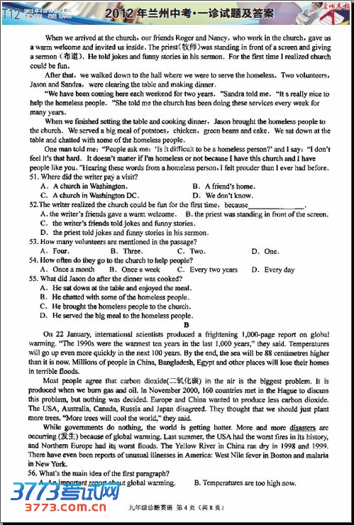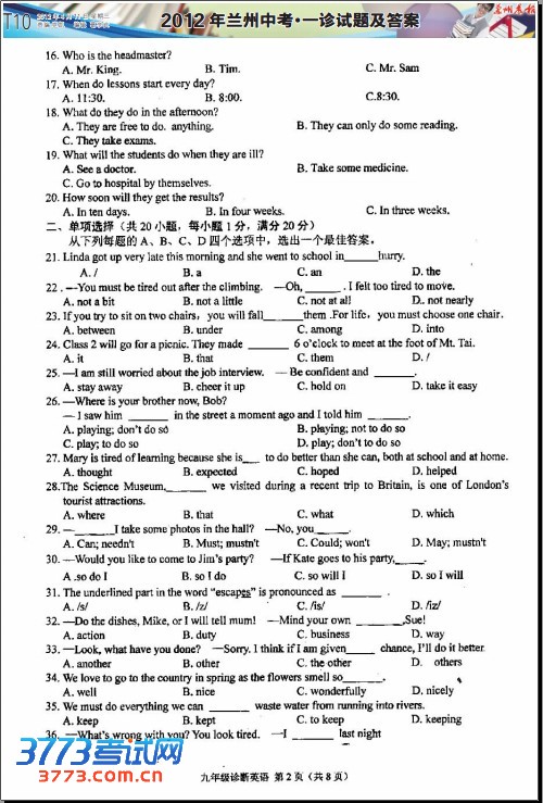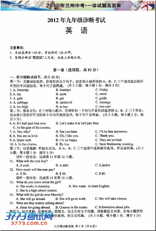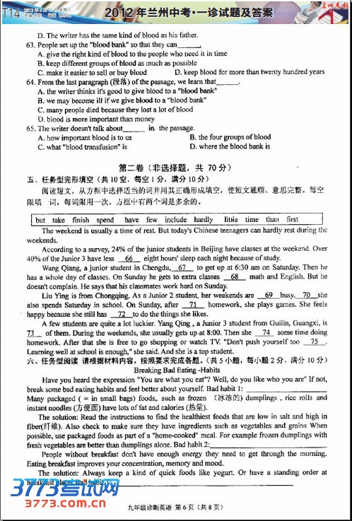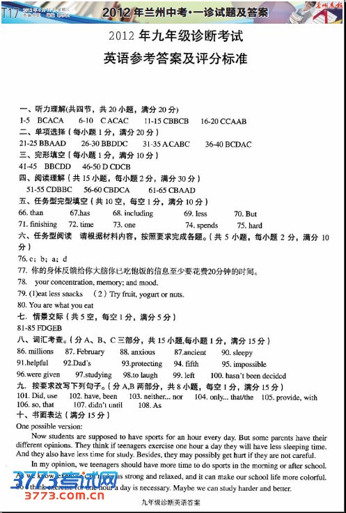 2012兰州中考甘肃省部分省级示范高中参加补录
