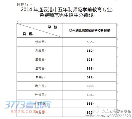 2014连云港五年制师范学前教育专业免费师范男生分数线