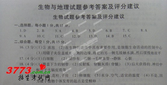 2012连云港中考生物试题答案评分建议