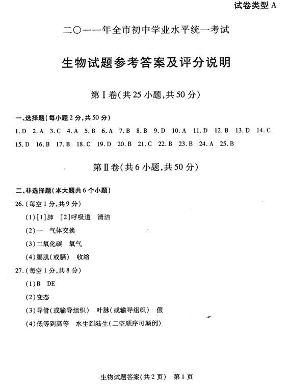 2011年山东聊城中考生物试题及答案