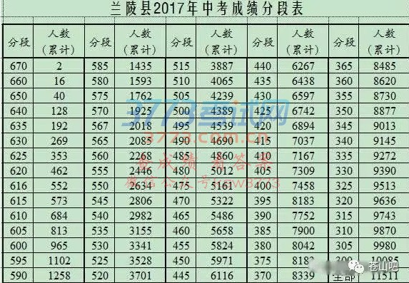 2017兰陵县中考成绩分段表