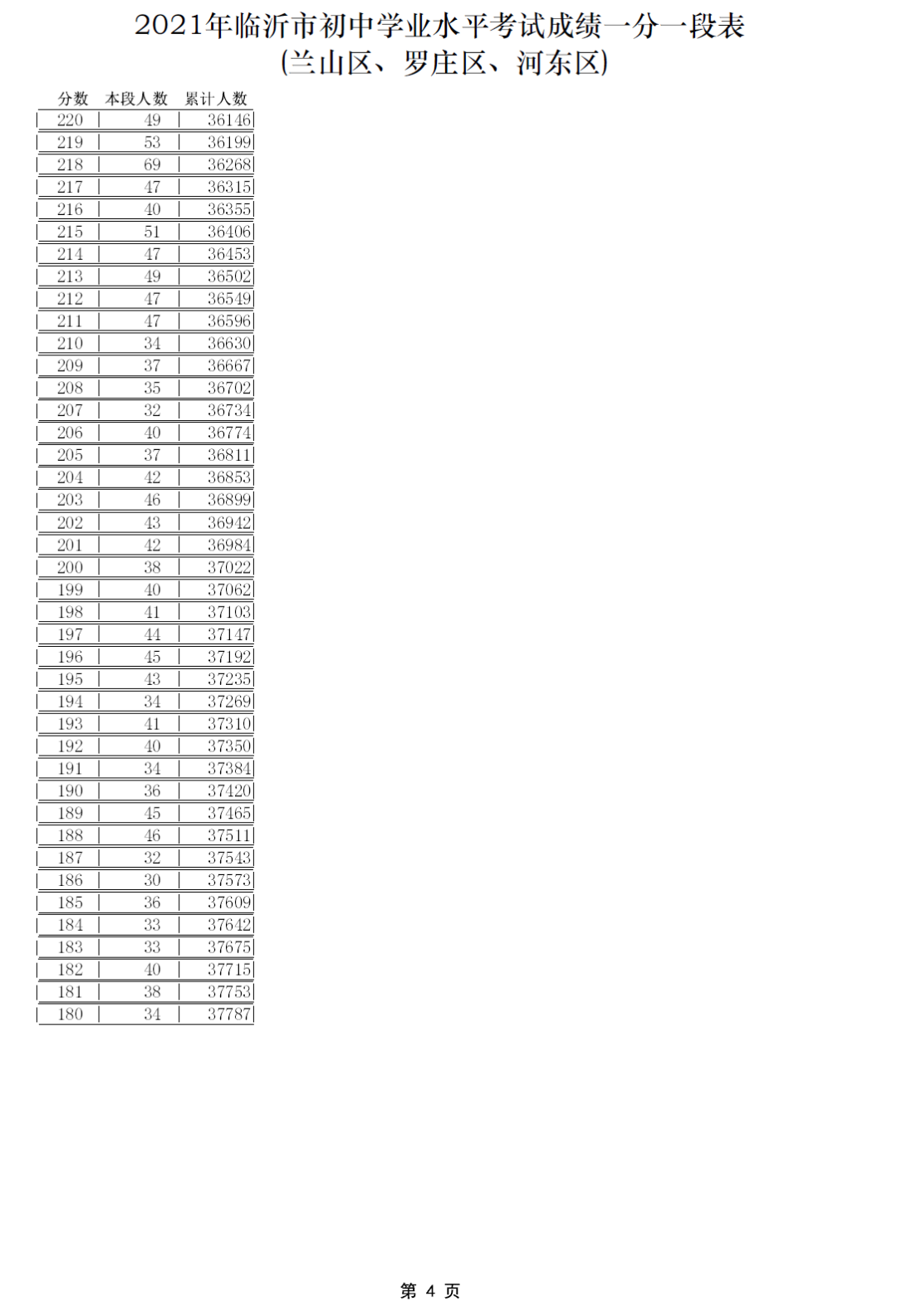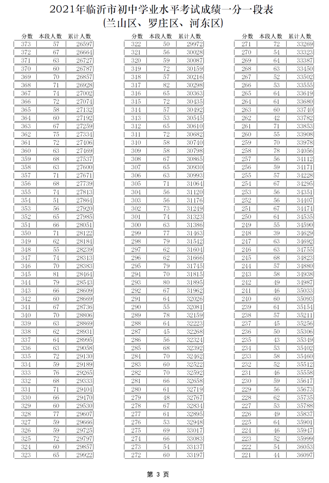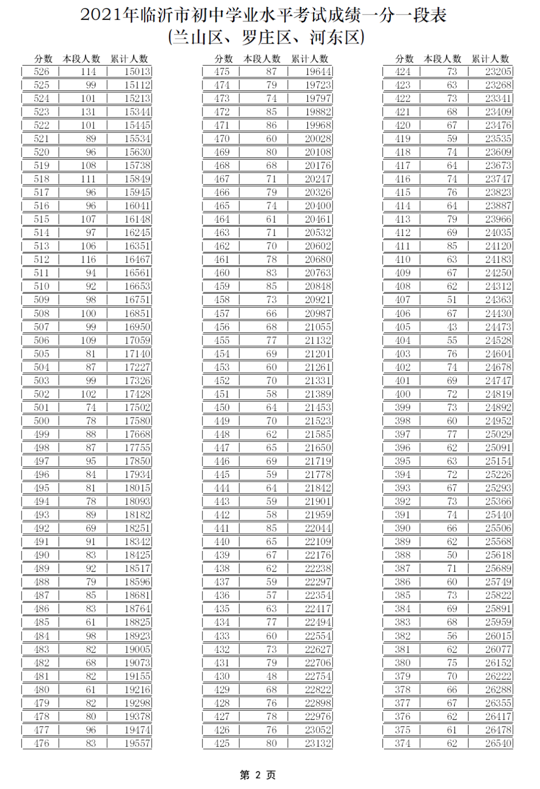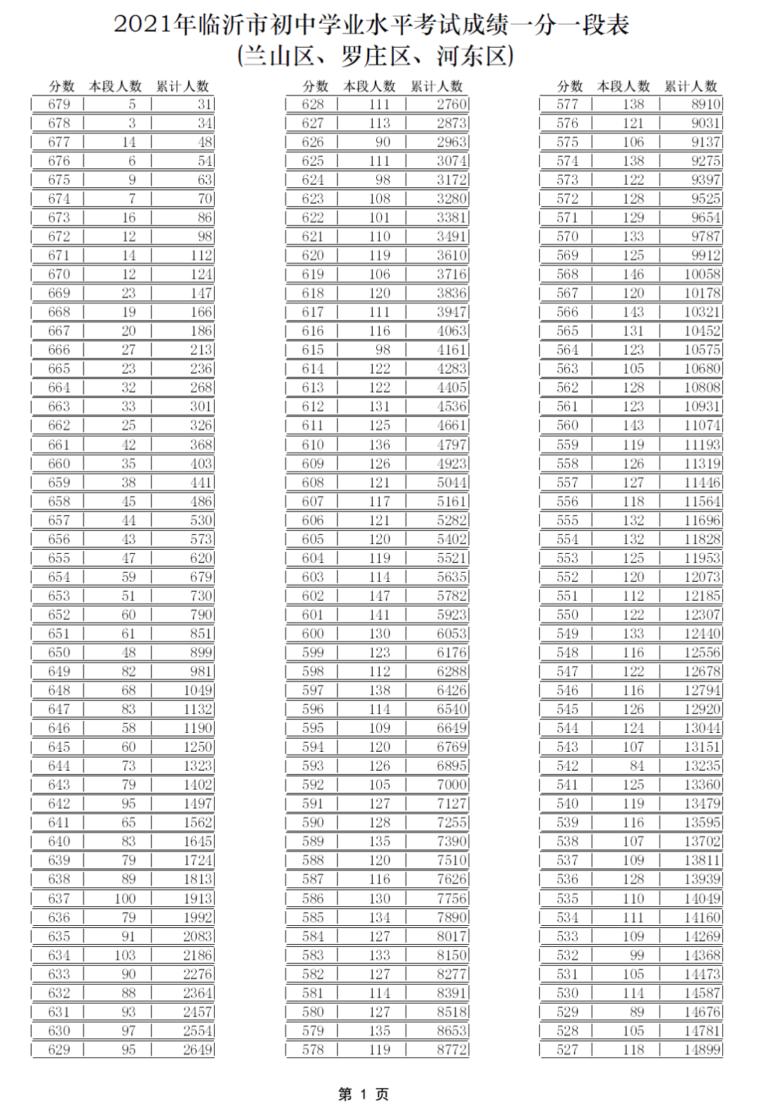 2021年山东临沂中考成绩一分一段表(兰山区、罗庄区、河东区)