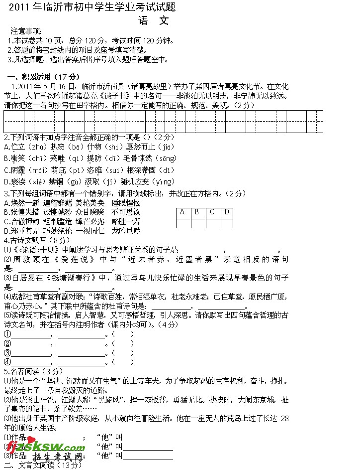 山东临沂2011年中考语文试题及答案