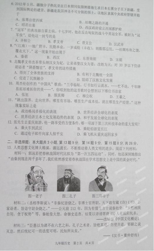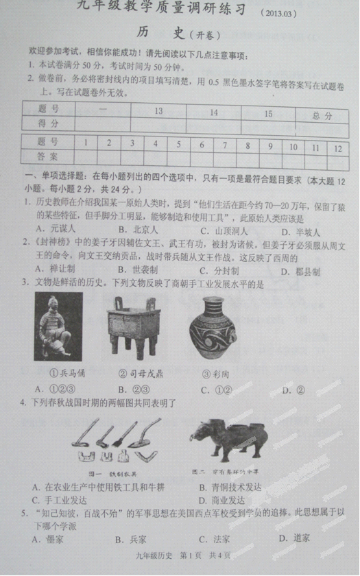淮安市淮阴区2013年九年级历史3月调研试题及答案