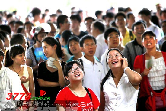 昨日上午,柳州市三中现场招录点,学生和家长看着大屏幕露出欣喜微笑。记者张存立摄