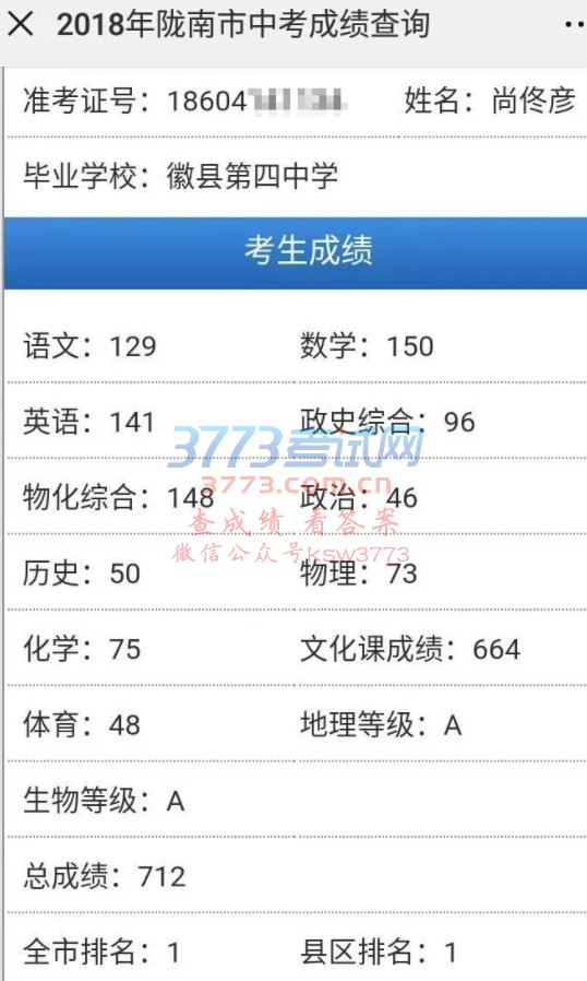 7月2日,陇南市2018年中考成绩公布,徽县第四中学考生尚佟彦同学以712分夺得全市总成绩第一名。继2017年徽县四中两名考生并列全市第一名之后,2018年中考中,全市总成绩第一名被徽县四中考生蝉联。