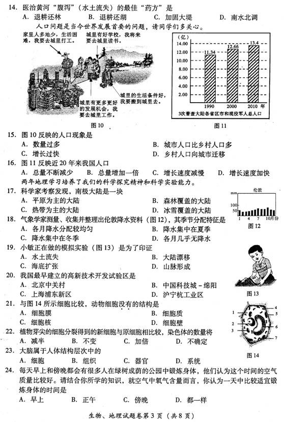 2012年绵阳市中考生物地理试卷答案及评分标准