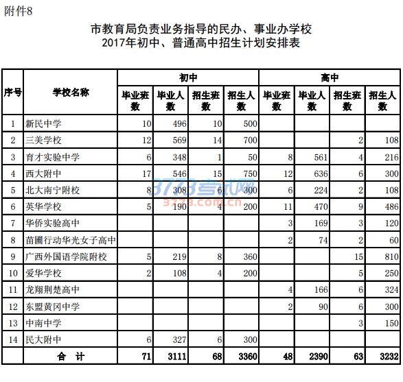 市教育局负责业务指导的民办、事业办学校2017年初中、普通高中招生计划安排表