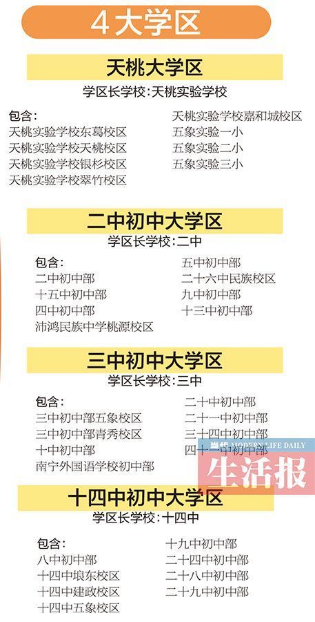 按照改革方案,南宁市各初中、小学将设置学区,学区(集团)一般以1所优质学校为学区长学校(龙头学校),与若干所同学段相对薄弱的学校组成教育融合发展共同体。近日,南宁市教育局公布了南宁市直属中小学学区划分方案,这也意味着南宁市义务教育学校学区制改革即将拉开大幕。