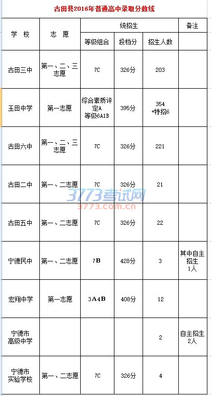 古田县2016年普通高中录取分数线 学 校 志 愿 统招生 备注 等级组合 投档分 招生人数 "宁德市实验学校" 第一、二志愿 7C 326分 4