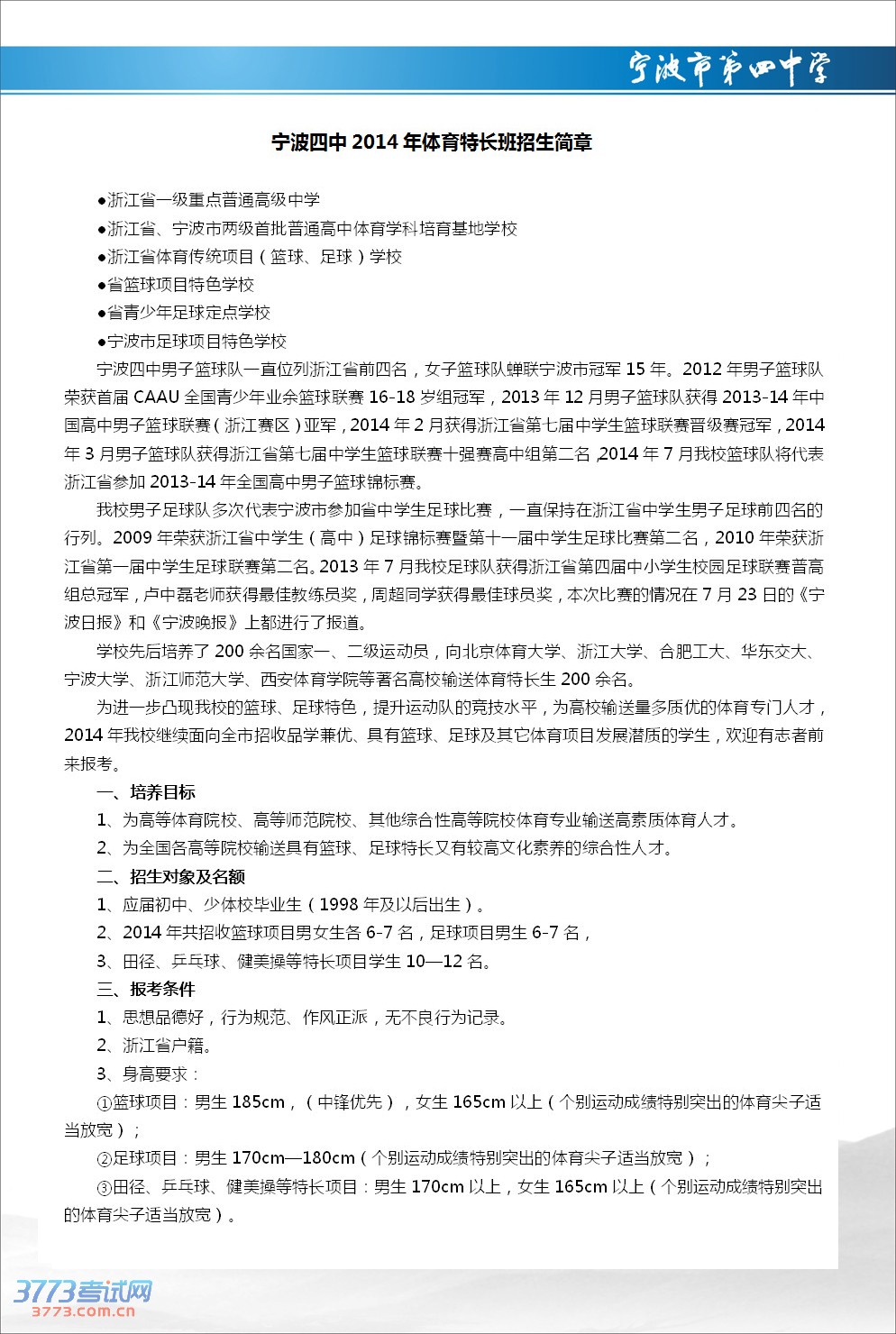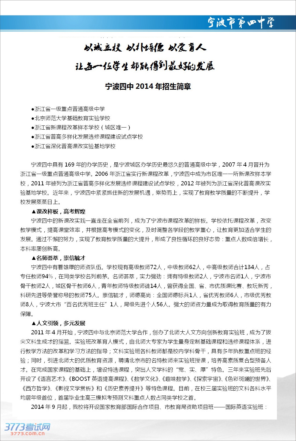 宁波三中2014年高中招生简章