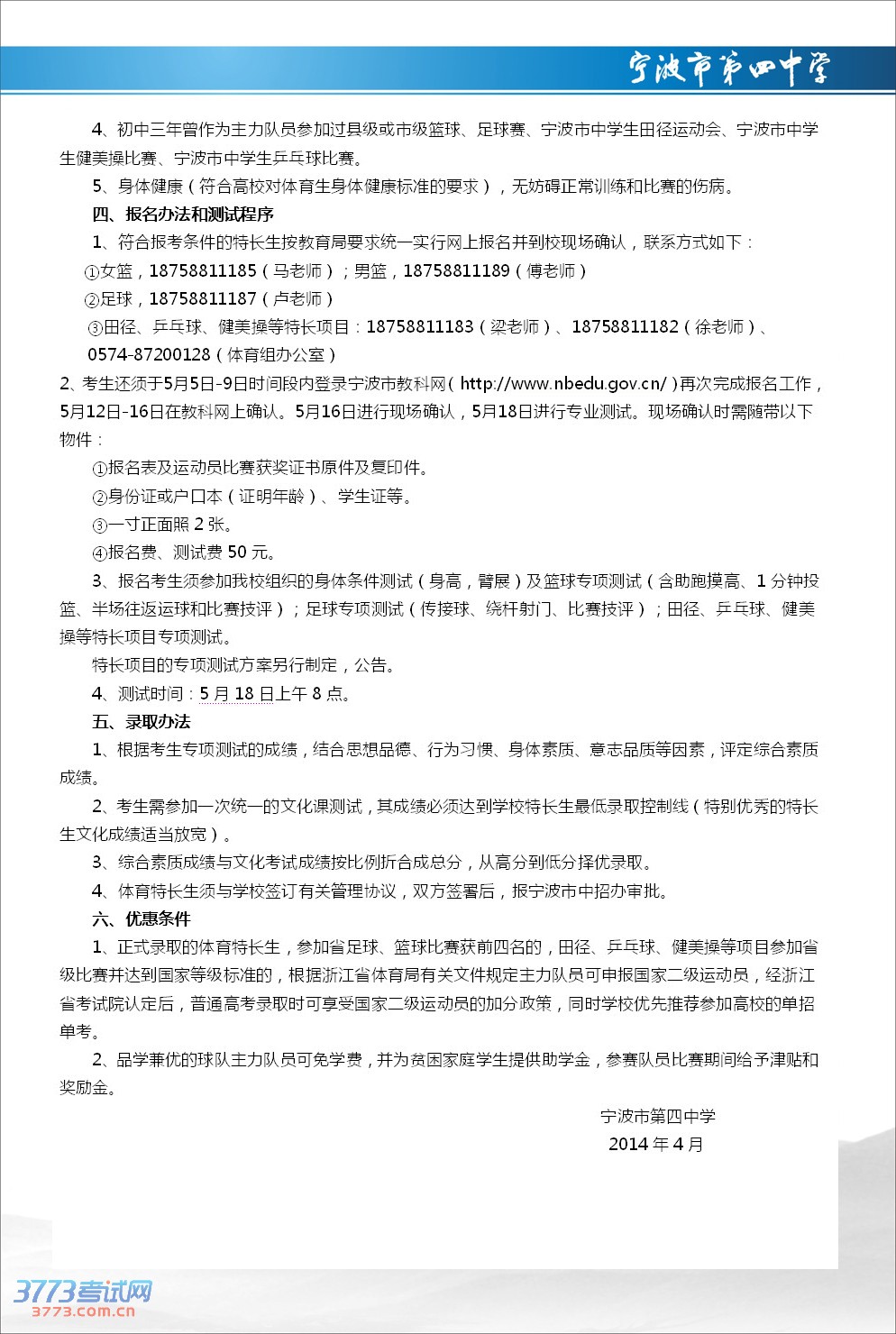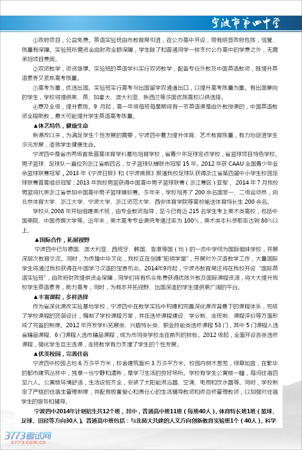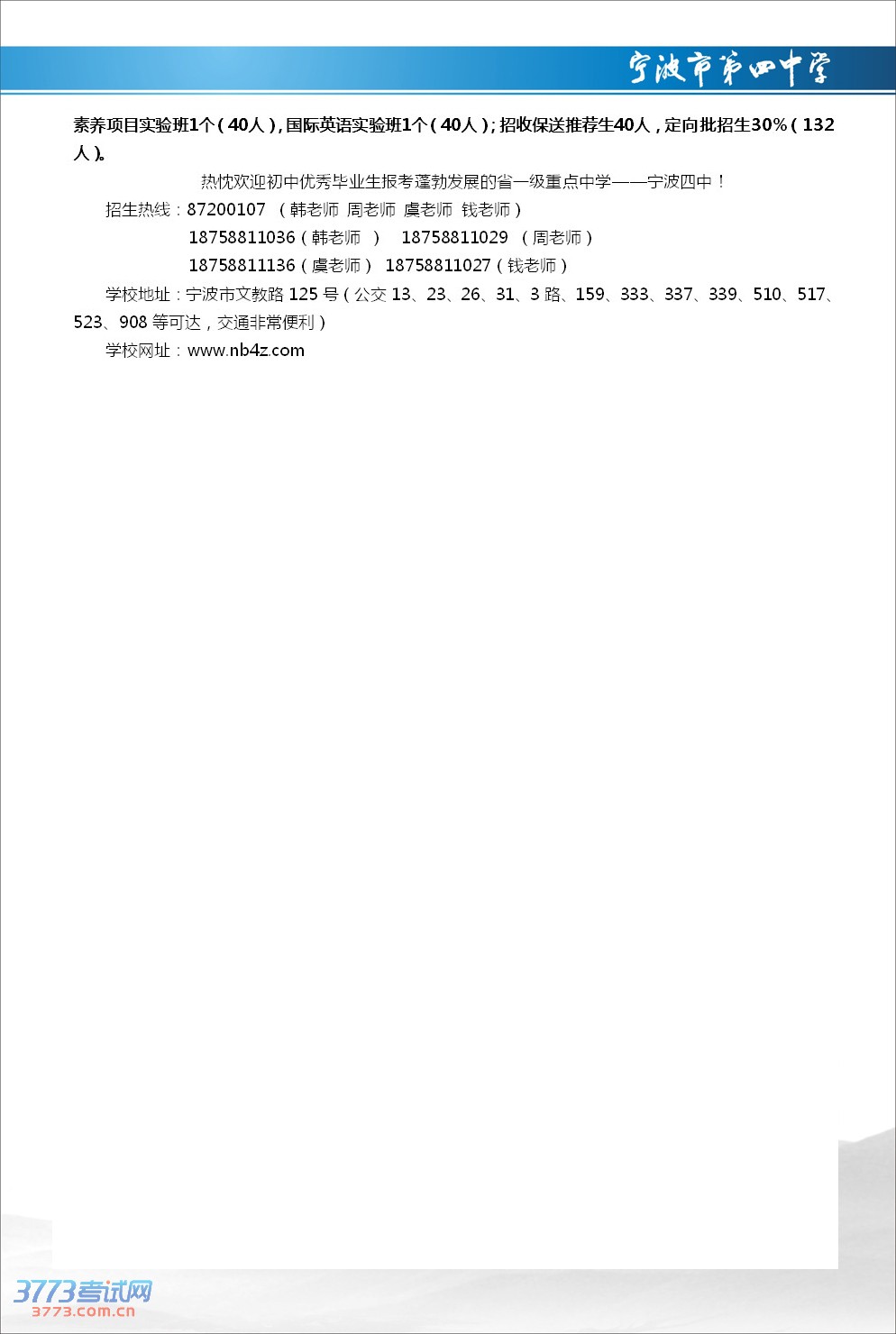 宁波市第四中学2014年招生简章