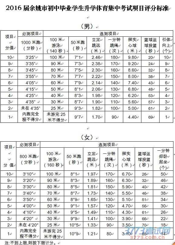 2016届余姚市初中毕业学生升学体育集中考试项目评分标准