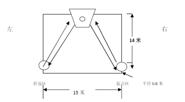 本体育考试场地采取全封闭管理,考生需使用IC卡,经入口翼闸检录处刷卡核对考生基本信息无误后,进入考试场地。所有考试项目均使用IC卡识别身份,记录成绩。考生在每项考试结束后可以在测试器材上刷卡当场打印成绩单确认考试成绩,所有考试项目结束后使用考试卡经出口翼闸出场,再次核对本人本次体育考试所有成绩。所有考试结束后以学校为单位打印考生所有成绩并交学校领队签字确认。考试场所配备医生若干名。中长跑(男1000米、女800米)1.场地器材:400 米标准环形塑胶跑道,考前丈量准确。跑道上标有明显的起、终点线。测试主机、地垫、腕表、其他设备等。 2.考试办法:裁判员刷考生考试卡,仪器正确显示考生的姓名、考号、照片等信息并自动分配考生腕表号码,考生戴上对应的专用腕表,站在起跑线,用站立式起跑。当发令器发出起跑信号,考生起跑并按规定跑向终点线,如有抢跑者,全组召回重跑,抢跑二次者成绩作零分,到达终点后测试成绩将在仪器上自动生成,仪器自动评出中考得分,并通过成绩公示系统实时公示(成绩及分数),可打印单项测试成绩单。考生测试完毕将专用腕表交还给裁判员,持考试卡离开测试区域,每人测试1次。50米跑1.场地器材:100米以上的直形塑胶跑道,考前丈量准确。跑道上须标有明显的起、终点线。电动计时器等。 2.考试办法:裁判员核对考生考试卡,考生按照分配的跑道号站在起跑线,起跑姿势为站立式,当发令枪发出起跑信号,考生起跑并按规定跑向终点线,如有抢跑者,全组召回重跑,抢跑二次者成绩作零分,到达终点后测试成绩将在仪器上自动生成,仪器自动评出中考得分,并通过成绩公示系统实时公示(成绩及分数),可打印单项测试成绩单。每人最多可测试2次(第二次测试时组别、跑道号不变),记录其中最好的一次有效成绩。测试结束后持考试卡离开测试区域。立定跳远1.场地器材:测试主机、测试杆、专用测试垫等。 2.考试办法:裁判员刷考生考试卡,仪器正确显示考生的姓名、考号、照片等信息,确认无误后开始测试。考生在专用测试垫起跳线后两脚自然分开站立,语音提示后原地两脚同时起跳,不得垫步和小跳, 动作完成后向跳跃前方任一侧走出测试垫。仪器会自动测量判定跳远距离并记录成绩,并识别起跳踩线等犯规动作,有语音或警鸣提示犯规,如起跳犯规自动识别该次跳跃成绩无效。每人最多可测试 3 次,记录其中最好的一次有效成绩并评出中考得分。通过成绩公示系统实时公示(成绩及分数),可打印单项测试成绩单。测试结束后持考试卡离开测试区域。掷实心球(2千克)1.场地器材:4米宽、20米长的平地一块,质量2千克实心球、测试主机、专用测试仪器等。 2.考试办法:裁判员刷考生考试卡,仪器正确显示考生的姓名、考号、照片等信息,确认无误后开始测试。考生在投掷线后身体正对投掷方向两脚前后或左右开立,双手持球在头上方,原地向前过头顶掷出,球出手后后脚才可向前迈出一步,但不得踩线或超线。仪器能自动测量判定投掷距离并识别起掷踩线或投掷后踩线等犯规动作,有语音或警鸣提示犯规。每人最多可测试 3 次,记录其中最好的一次有效成绩并评出中考得分。通过成绩公示系统实时公示(成绩及分数),可打印单项测试成绩单,测试结束后持考试卡离开测试区域。篮球运球投篮1.场地器材:标准篮球场半个(15*14 米),橡胶篮球、专用测试仪器、IC卡读卡器等。篮圈与地面平行,离地面高度3.05米,并悬挂篮网。以中线与边线的相交点为圆心(0.8米为半径)作弧,成1/4圆作为运球的起点区,另一对应点作为折返点。(测试场地见图示)