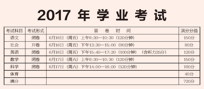 2017宁波中考时间科目及分值