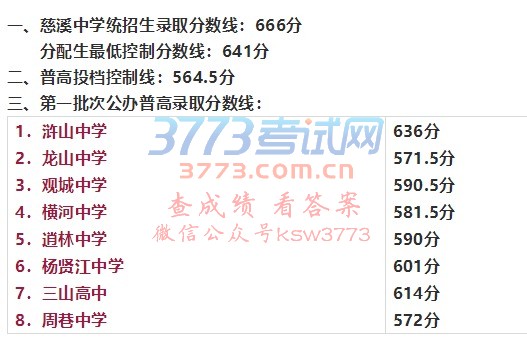 慈溪市普通高中提前批次和第一批次录取分数线划定