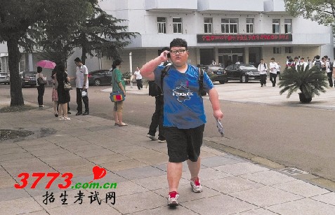 图为中考第一天,上午语文考试结束后,第一名走出考场的考生表情很轻松,高兴的打电话给家长说“考题很简单”。